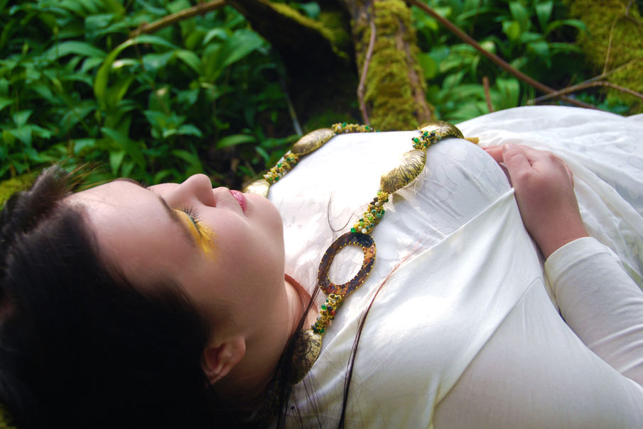 Dear little Mossycoat. I found her coat, it was in tatters. Her fine white silk dress was torn, and her crown had melted all over the pebbles. From rags to riches and now back into the overgrown moss once more. But I preserved you dear Mossycoat. The dead moss from her coat has been stitched into golden moss-etched pebbles and strung with thousands of precious mossy beads, culminating in a large golden pendant; where the magic lies. I unearthed two segments of her crown, the circles still perfect, and I stretched out her white silk dress to protect the wishes. Underneath the silk lies the only piece of the Mossycoat that still possesses the wishing power. If you’re quiet, and close your eyes tight and whisper your wish into the coat, Mossycoat may just turn you into what you desire to be the most.